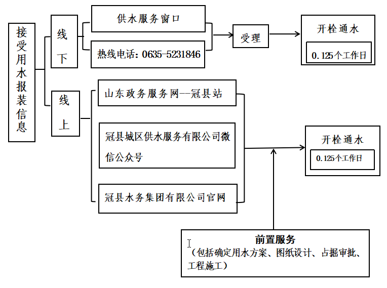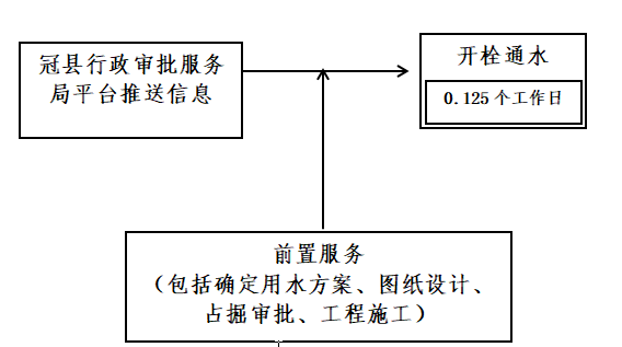 流程說(shuō)明:供水企業(yè)通過(guò)冠縣行政審批服務(wù)局獲取項(xiàng)目建設(shè)信息后,主動(dòng)對(duì)接,先行開展確定用水方案、圖紙?jiān)O(shè)計(jì)、工程施工等服務(wù),辦理用水工程涉及的占道、掘路、占用綠地、伐移樹木等相關(guān)行政審批手續(xù),提前完成外線工程實(shí)施,為客戶提供“無(wú)感免申請(qǐng)”服務(wù)??蛻粜枰盟畷r(shí),0.125個(gè)工作日內(nèi)開栓通水。